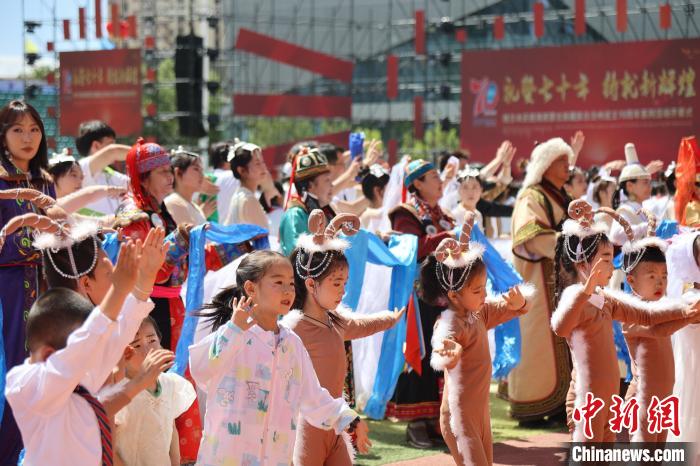 圖為身穿民族服飾的民眾和少年兒童載歌載舞。中新社記者 張添福 攝