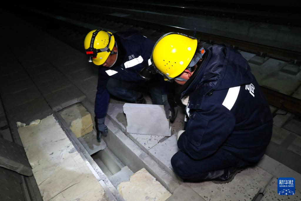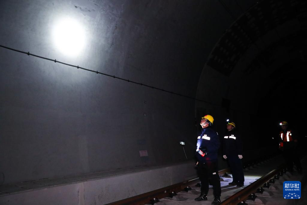1月14日凌晨,橋隧工在新烏鞘嶺隧道內(nèi)開展全面檢查。新華社記者 郎兵兵 攝