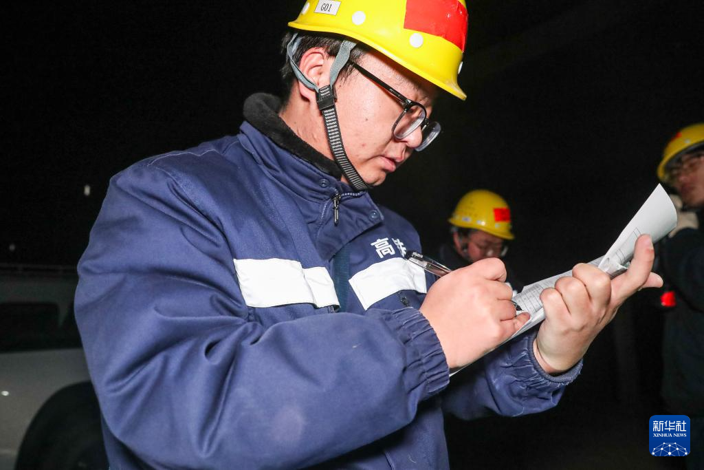 1月13日晚,在新烏鞘嶺隧道通道門外,“95后”橋隧工工長(zhǎng)金炻正在清點(diǎn)工具材料。新華社記者 郎兵兵 攝