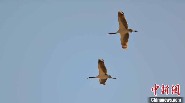 兩只黑頸鶴結伴翱翔,姿態優美。 江飛波 攝