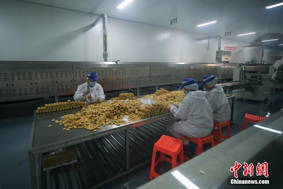 圖為7月28日,洛隆洛宗特色產品開發公司工人包裝青稞餅干。中新社記者 何蓬磊 攝