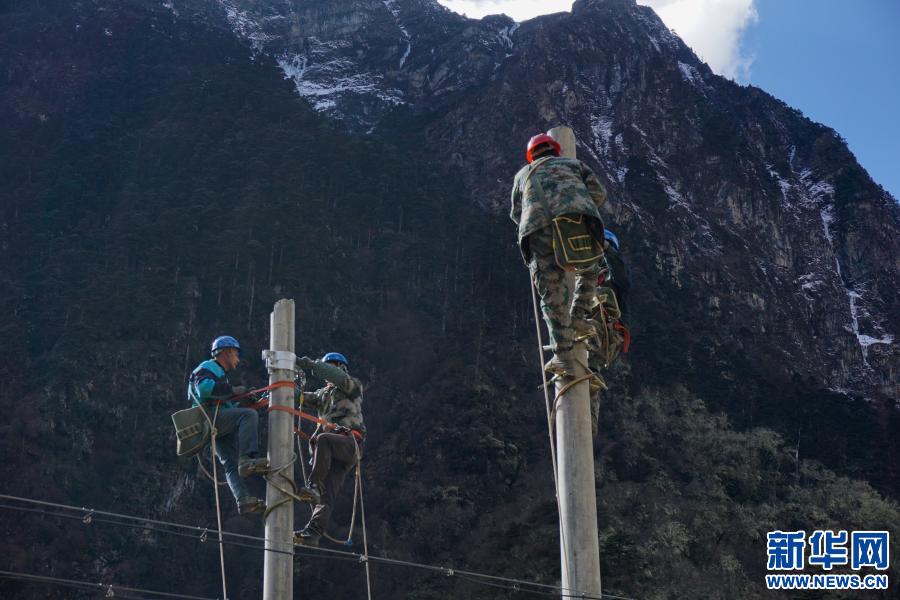 西藏玉麥鄉電力線路全線貫通,圖為工人在玉麥鄉境內施工(2017年12月17日攝)。新華社發(白峰 攝)