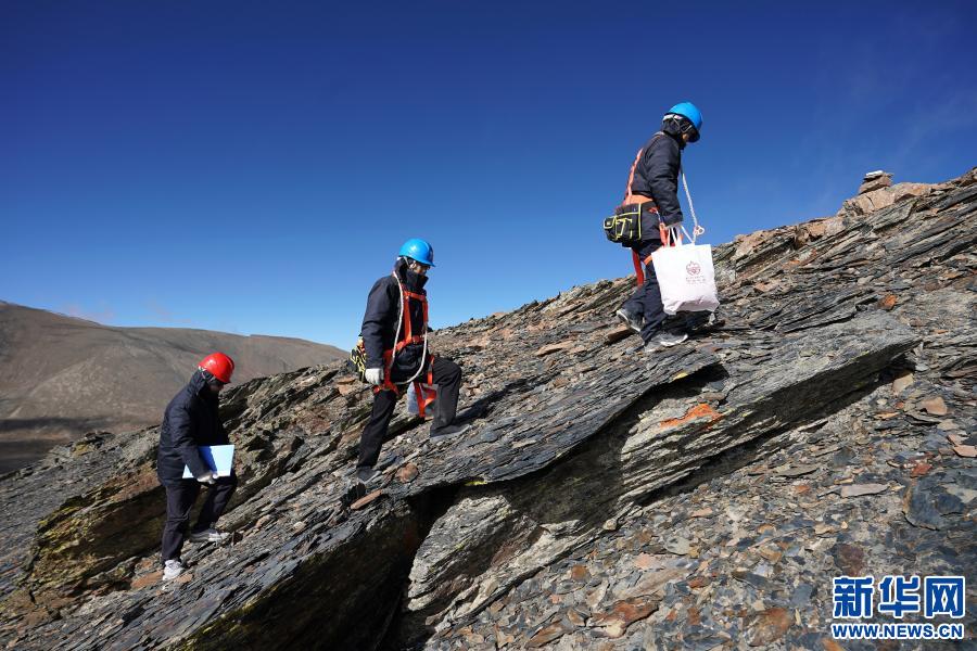在西藏山南市洛扎縣,國家電網山南供電公司輸電運檢中心員工龔朝偉(右)和國家電網安徽省電力有限公司援藏工作人員徐四勤(中)、吳寅(左)向浪洛線197號鐵塔前進(2020年11月4日攝)。新華社記者詹彥 攝