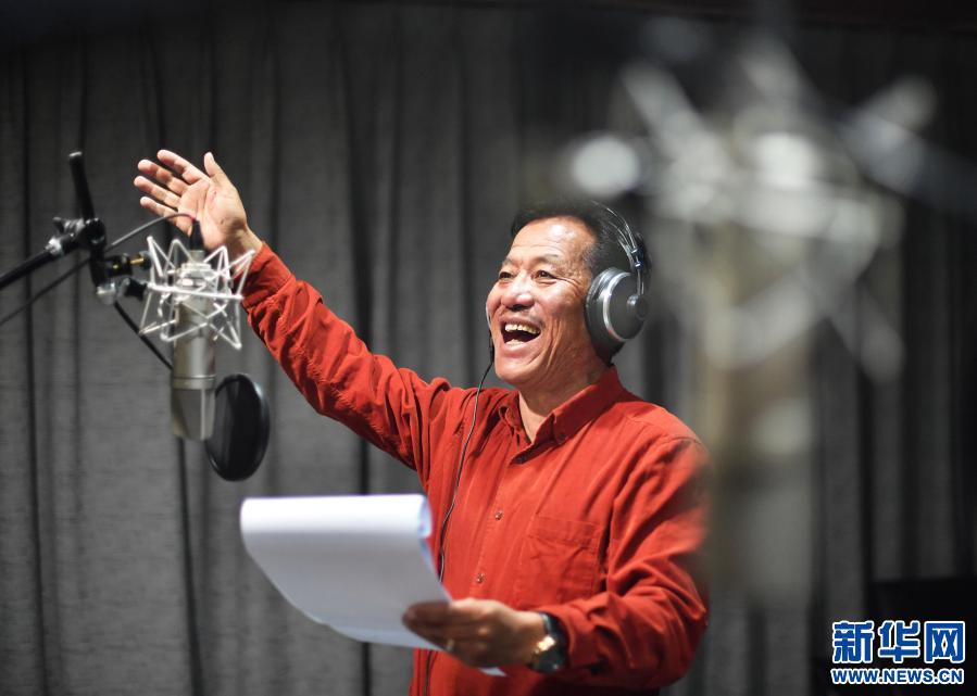 在中國西藏廣播電影電視藏語節目譯制中心,配音演員倫珠巴桑正在給藏語節目配音(2019年3月6日攝)。新華社記者普布扎西 攝