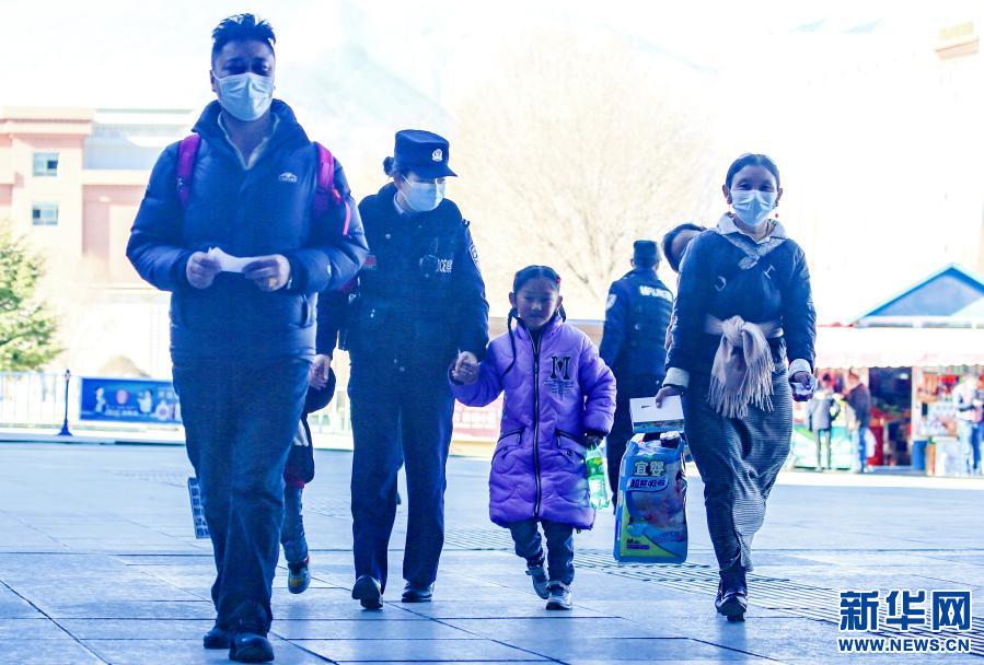 1月10日,“女子格桑花”警組民警在拉薩火車站帶領小旅客出站。新華社發(胡安鵬、黃飛攝影報道)