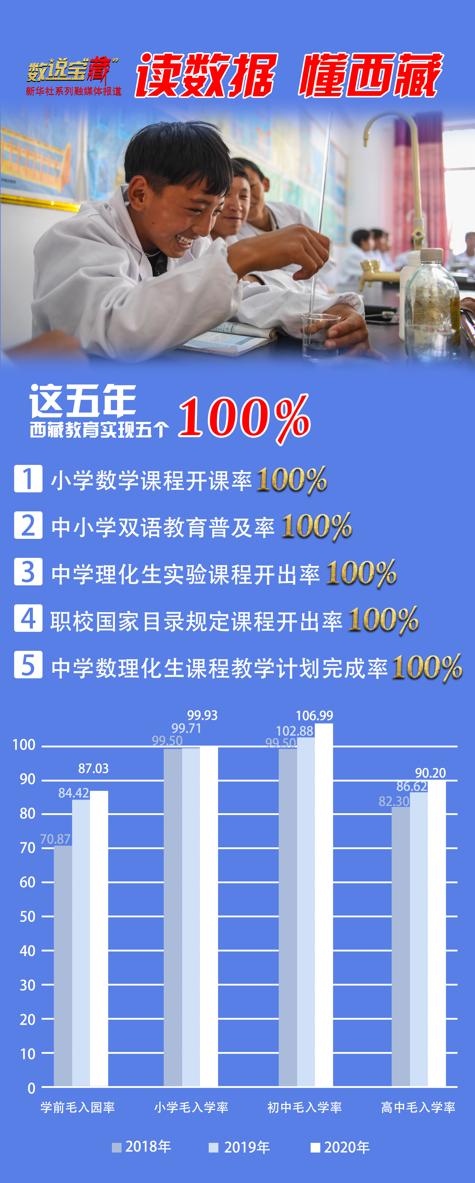 西藏自治區教育廳公布的數據顯示:“十三五”時期,西藏教育“五個100%”全面實現,即中小學雙語教育普及率100%,小學數學課程開課率100%,中學數理化生課程教學計劃完成率100%,中學理化生實驗課程開出率100%,職業技術學校國家目錄規定課程開出率100%。