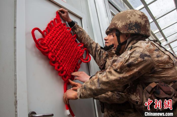 該旅官兵正在用中國結點綴裝飾保溫方艙。 王述東 攝