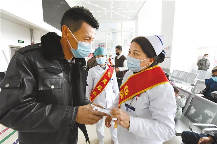 圖為拉薩市人民醫院醫護人員為前來就診的患者服務