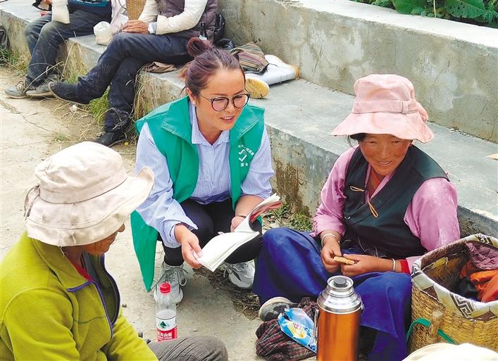 圖為山南市曲松縣駐村工作隊隊員(中)向老百姓宣講黨的優惠政策