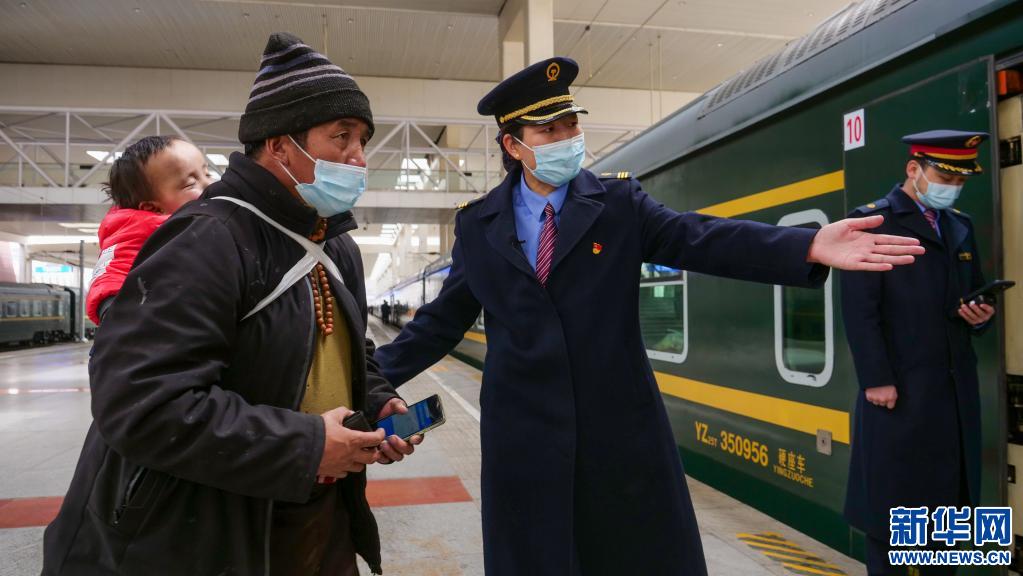 斯朗卓瑪(中)在拉薩火車站引導乘客上車(3月22日攝)。新華社記者 旦增尼瑪曲珠 攝
