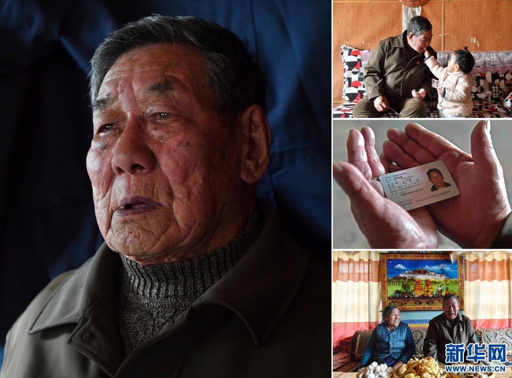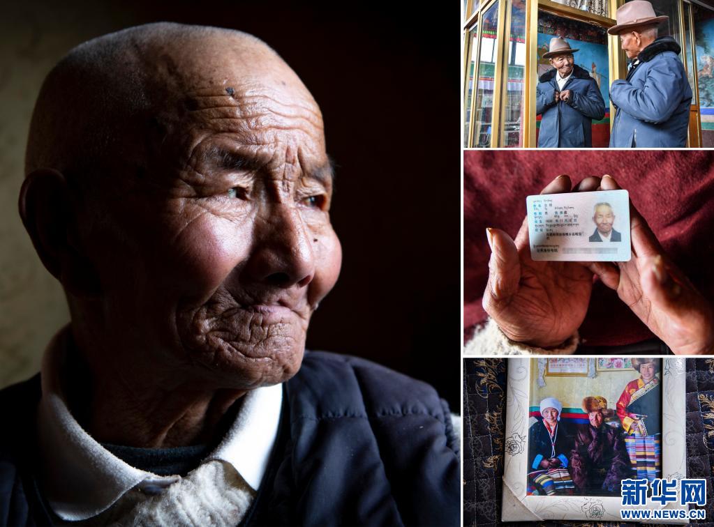這是一張拼版照片,左圖為索朗楊佩的肖像;右上圖為索朗楊佩(左)和孩子一起玩耍;右中圖為索朗楊佩的身份證;右下圖為索朗楊佩(右)和老伴兒卓嘎在米林縣單嘎努覺村的家中留影(照片均為3月30日新華社記者孫瑞博攝)。新華社發