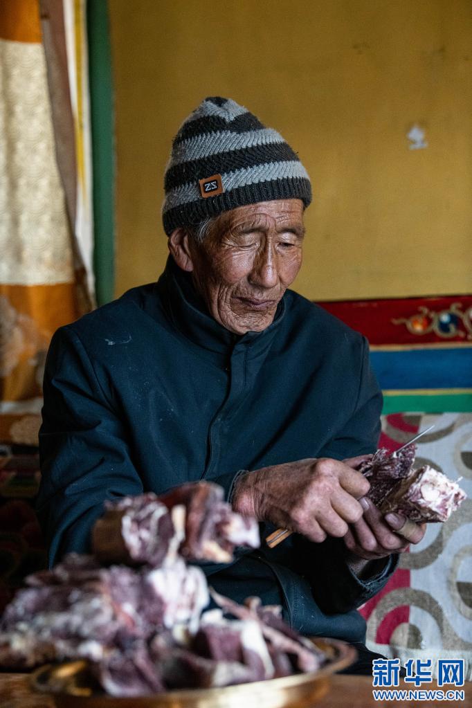 次仁老人在拉薩市當雄縣寧中鄉麥靈村的家里吃風干牦牛肉(4月16日攝)。新華社記者 孫瑞博 攝