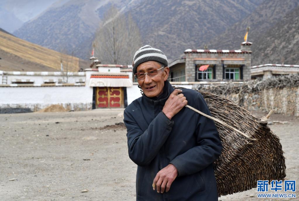 在拉薩市當雄縣寧中鄉麥靈村,次仁老人背著籮筐出門取干牛糞(4月16日攝)。新華社記者 覺果 攝