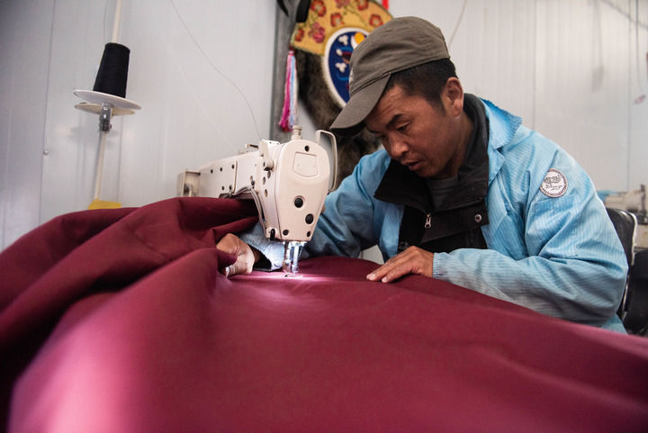 走進廠房,只能聽見縫紉機轉動的聲音。平措占堆坐在縫紉機前,雙眼盯著跳動的針頭,手推深紅色布料伸展開去,這是制作藏式門簾的步驟之一。