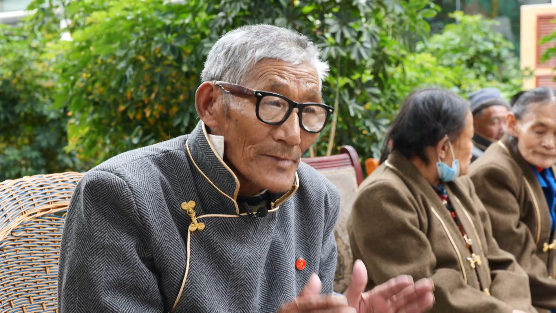 阿里地區老人護理院老人 拉松(藏語):護理員們經常給我們洗頭、洗澡、剪指甲,就像對待自己的親生父母一樣照顧我們,不嫌臟。好吃好喝都有,平時還可以跟其他老人一起玩玩骰子、打打撲克,很開心、很快樂,這都是國家的恩惠。