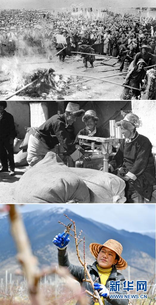 這是一張拼版照片:上圖為1959年8月,西藏墨竹工卡縣的翻身農奴焚燒三大領主的剝削文契(新華社發);中圖為1984年,江孜縣農民洛桑旺堆(左)向國家出售余糧。他家承包土地100多畝,農忙種地,農閑搞建筑、跑運輸(新華社記者土登攝);下圖為2020年3月22日,西藏林芝現代蘋果標準化示范園的工作人員為桃樹剪枝。該示范園實施農機農藝結合、水肥一體化及“果草畜循環”,大面積推廣蘋果矮砧集約高效栽培技術,帶動米林縣羌納鄉林巴、才巴、色沃村及附近的農戶增收(新華社記者 張汝鋒 攝)。新華社發