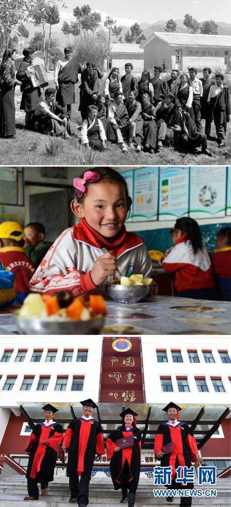 這是一張拼版照片:上圖為拉薩中學的應屆畢業生在校園里練歌,準備參加畢業典禮(新華社記者任用昭攝);中圖為一名藏族女孩在西藏雙湖縣嘎措鄉小學內享受“三包”(包吃、包住、包學習費用)政策(2014年6月29日新華社記者普布扎西攝);下圖為2017年11月10日,西藏大學舉行首屆博士研究生畢業典禮,向4名畢業生授予博士學位。這4名博士分別來自藏族歷史專業、藏語言文學專業及高原醫學專業(新華社記者覺果攝)。新華社發