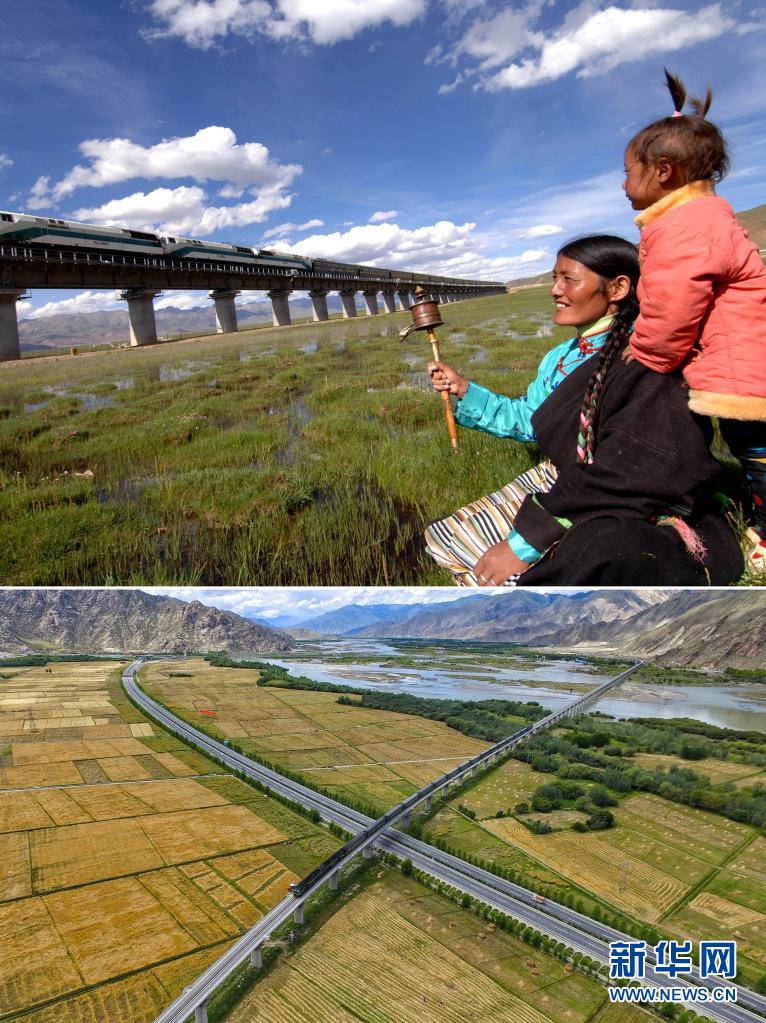 這是一張拼版照片:上圖為西藏當雄縣藏族群眾在觀看火車駛過(2006年6月17日 新華社記者覺果攝);下圖為在西藏拉薩市曲水縣拍攝的公路與鐵路(2016年8月17日新華社記者普布扎西攝 無人機照片),西藏已形成了公路、鐵路、航空的立體交通網絡。新華社發