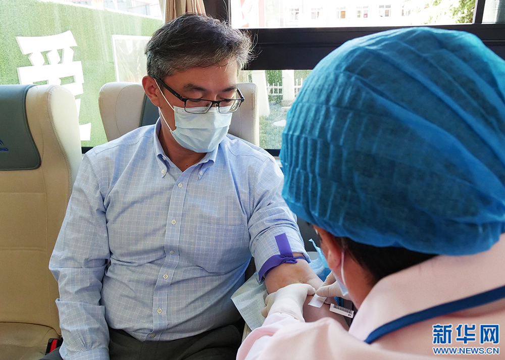 5月27日,來自國家衛生健康委員會醫政醫管局的援藏干部、中組部醫療人才“組團式”援藏總領隊陳虎在獻血。(新華網 旦增努布攝)