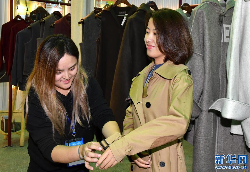 顧客在藏博會上試穿當地產的服裝(2018年9月8日攝)。 新華社記者 覺果 攝