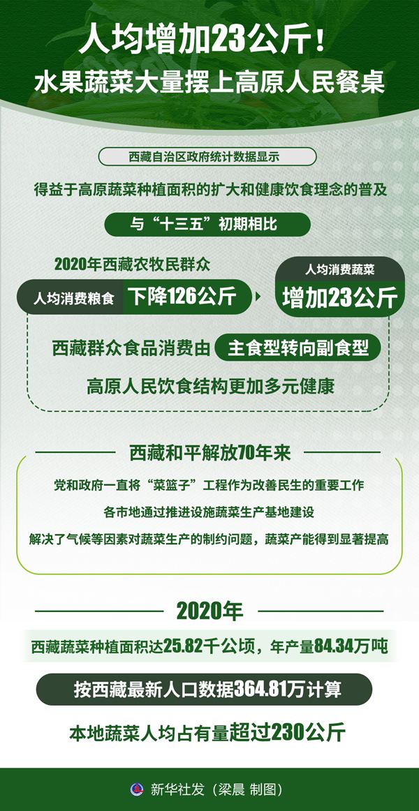 西藏自治區政府統計數據顯示,得益于高原蔬菜種植面積的擴大和健康飲食理念的普及,與“十三五”初期相比,2020年西藏農牧民群眾人均消費糧食下降126公斤,人均消費蔬菜增加23公斤,西藏群眾食品消費由主食型轉向副食型,高原人民飲食結構更加多元健康。