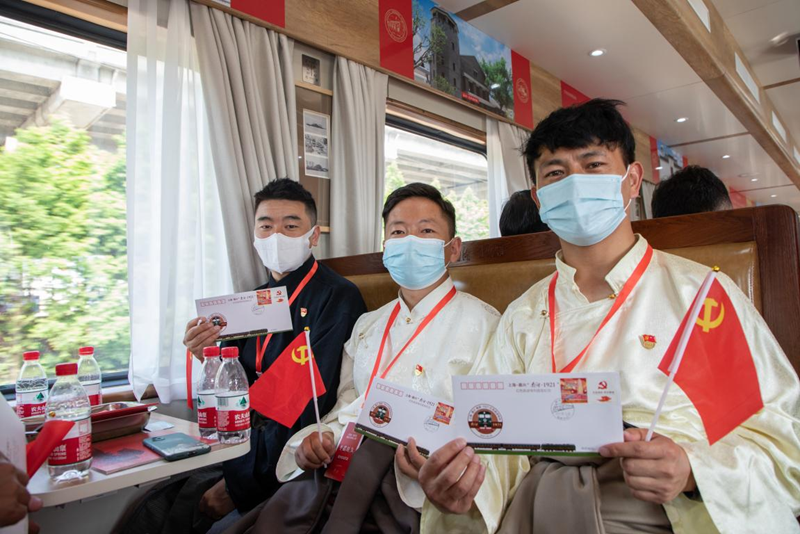 6月25日上午,上海至嘉興的“南湖·1921”紅色旅游列車正式開通。上午8時,身著藏裝的西藏自治區那曲市色尼區代表團乘上列車前往嘉興。