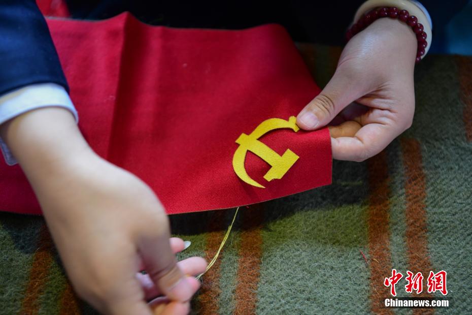 6月29日上午,西藏自治區民辦職業技能培訓學校行業黨委在拉薩市城關區開展慶祝建黨100周年活動,現場黨員們通過開展重溫入黨誓詞、縫制黨旗、走訪慰問等紀念活動,回顧黨的百年光輝歷程。圖為縫制黨旗現場。貢嘎來松 攝