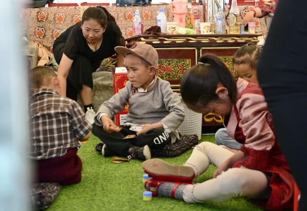 在日喀則市郊區(qū)的一個度假村,家長帶孩子在帳篷里“過林卡”(2019年6月23日攝)。新華社記者 張汝鋒 攝