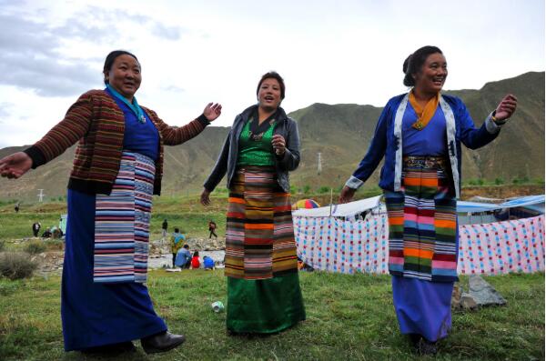 在拉薩東郊的小河邊,“過林卡”的婦女跳起歡快的舞蹈(2015年9月13日攝)。新華社記者 張汝鋒 攝