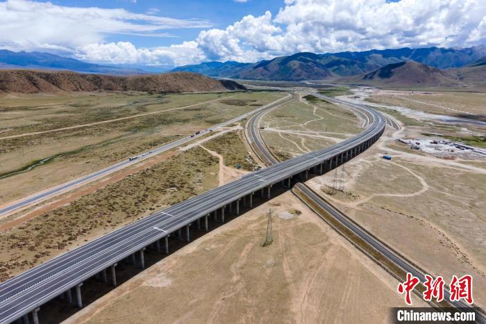 圖為航拍G6京藏高速那曲至羊八井段,目前該段高速主線已全部完成建設,通車在即。 江飛波 攝