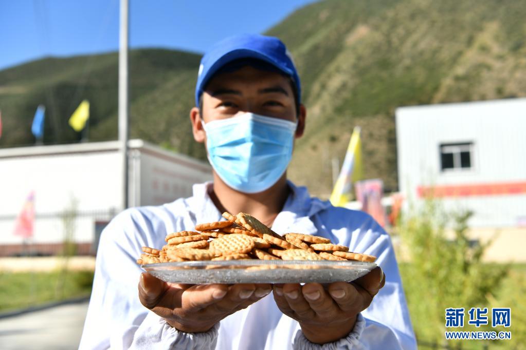 洛宗特色產品開發公司的員工在園區內展示公司生產的糌粑餅干(7月24日攝)。新華社記者 李鑫 攝