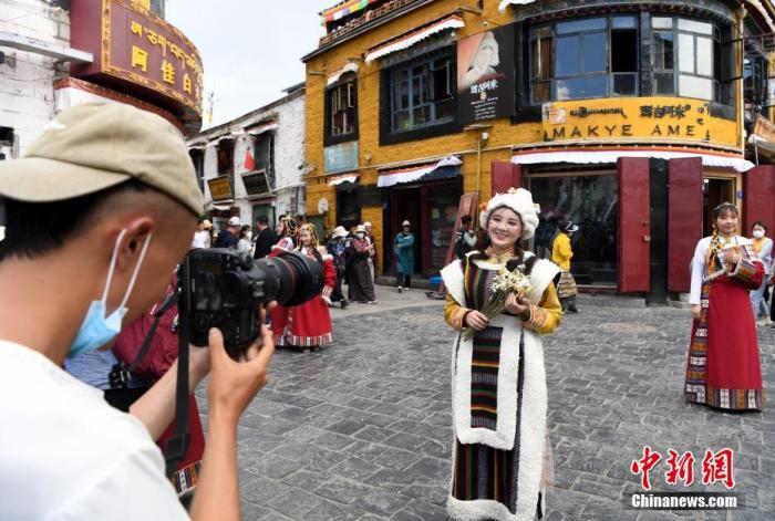 圖為7月24日,游客穿上藏族傳統服飾在拉薩市八廓街拍照留念。中新社記者 貢嘎來松 攝