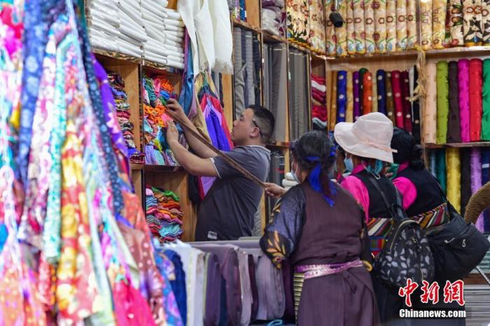 拉薩老城區的八廓街上,花樣繁多的藏裝店構成一道絢爛民族風。店中選購藏裝的顧客,既有本地人,也不乏口音各異的外地游客。22日下午,在此經營藏裝店10余年的卓瑪迎來“特殊”的客人。