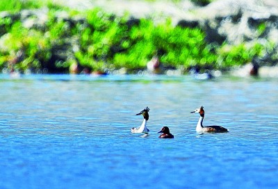 幾只水鳥在西藏拉薩的拉魯濕地嬉戲。新華社發
