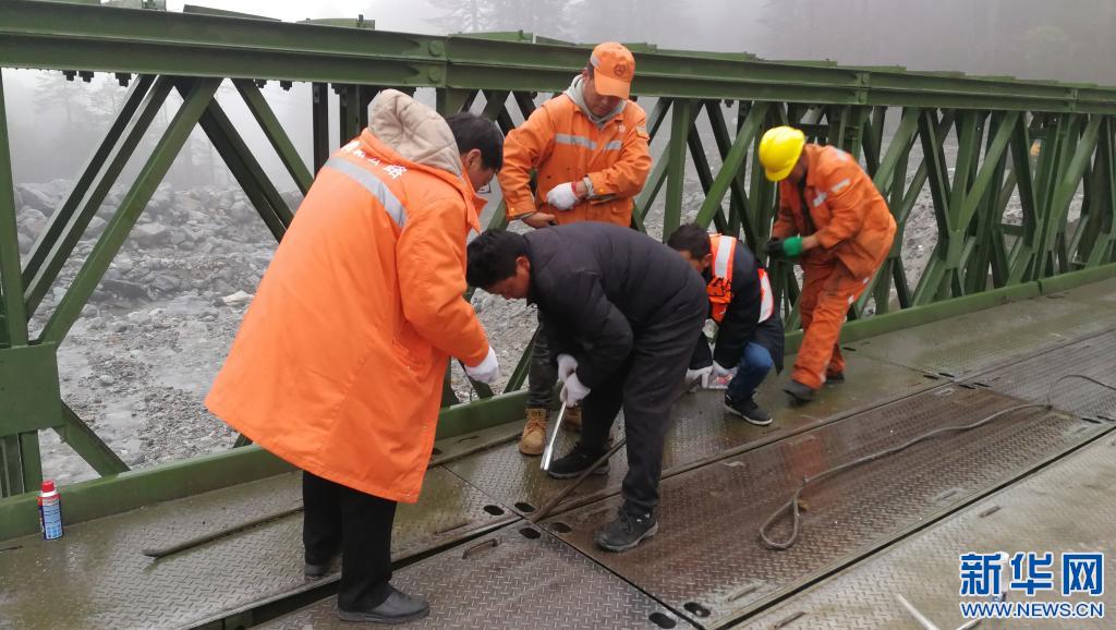 湯剛旦(左)和同事在扎墨公路上執行道路養護任務(5月13日攝)。新華社發