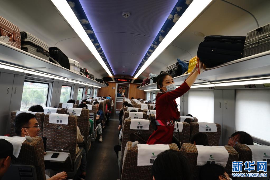 拉林鐵路復興號列車乘務員正在為旅客整理行李(2021年7月8日攝)。新華社記者 劉洪明 攝
