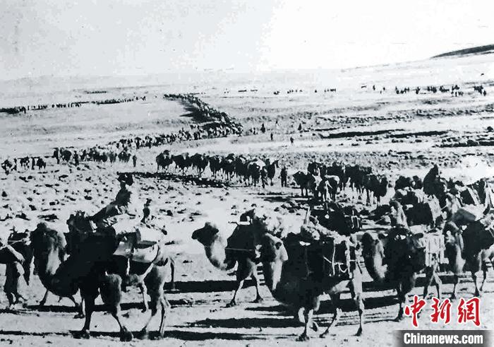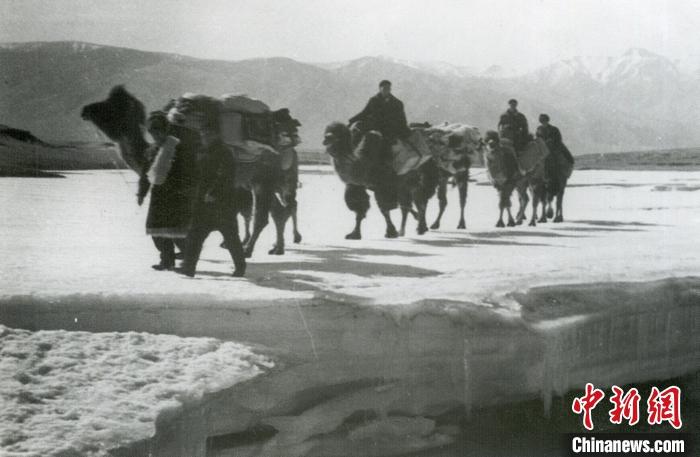 資料圖為1953年11月,西藏運輸總隊駝工往西藏徒步運輸物資。 中新社發 莫河駱駝場歷史陳列館 供圖