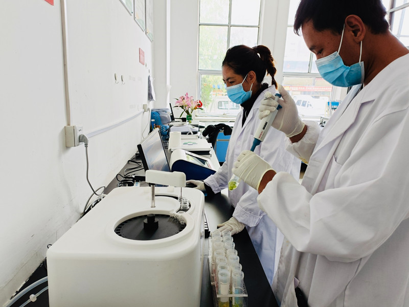 圖為西藏拉薩東嘎農副產品批發市場快檢實驗室工作人員在對該市場內農副產品進行檢測。記者 央金 攝