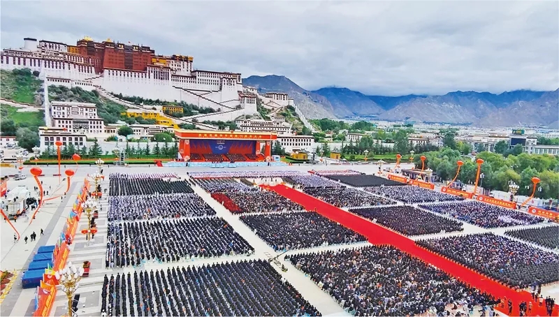 2021年8月19日,西藏各族各界干部群眾2萬多人歡聚在拉薩布達(dá)拉宮廣場,熱烈慶祝西藏和平解放70周年。新華社記者 孫瑞博/攝