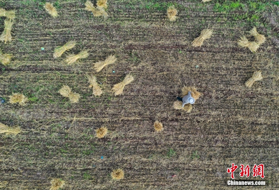 9月8日,西藏自治區拉薩市達孜區境內的農民在搶收青稞。金秋時節,拉薩河谷一帶青稞成熟,農民在青稞田忙碌,一片繁忙景象。(無人機照片) 中新社記者 貢嘎來松 攝