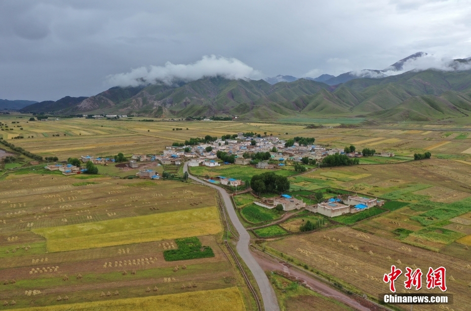 9月8日,西藏自治區拉薩市林周縣境內的田野美景。金秋時節,拉薩河谷一帶青稞成熟,呈現豐收美景。(無人機照片)中新社記者 貢嘎來松 攝