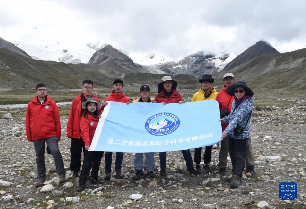 8月24日,在西藏日喀則市區(qū)域內(nèi)的喜馬拉雅山脈一處雪山下,中科院地理科學(xué)與資源研究所客座教授李渝生(中)和年輕隊(duì)員們合影。 新華社記者 杜剛 攝