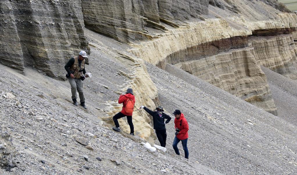 8月27日,科考隊員王昊(左)等人在西藏日喀則市定結縣區域內考察一個垂直地面的沉積剖面。隊員們根據傾斜層理判斷,數萬年前這里是一個巨大的堰塞湖。新華社記者杜剛 攝