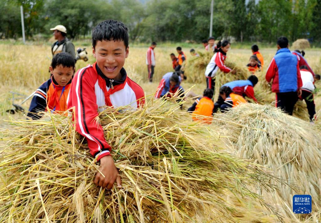 日喀則市上海實驗學校的學生們在青稞地里勞動(9月17日攝)。新華社 潘杰 攝