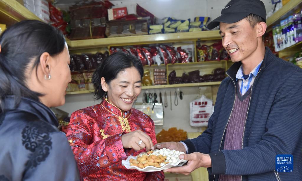阿卜杜杰力力·麥提如剛(右)于2010年從新疆和田墨玉縣來到西藏阿里獅泉河鎮做干果生意,并融入到獅泉河鎮藏布居委會的民族大家庭中。圖為阿卜杜杰力力·麥提如剛請當地藏族朋友品嘗來自家鄉的特產(9月22日攝)。新華社發(索朗羅布 攝)