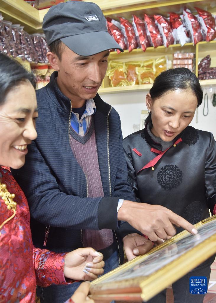 從新疆和田墨玉縣來到西藏阿里獅泉河鎮的阿卜杜杰力力·麥提如剛(中)給鄰居們看自己的家庭合影(9月22日攝)。新華社發(索朗羅布 攝)