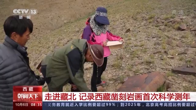 總臺記者 陳琴:現在我們是跟隨科考隊員來到了海拔4700米的加林山巖畫這么一個分布區域,這里的位置就是在尼瑪縣榮瑪鄉依布茶卡鹽湖的旁邊,我們看見科考隊員正在對這幅巖畫進行登記和記錄。