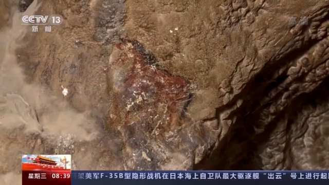 總臺記者 陳琴:現在我們就來到納木錯環湖科考巖畫調查點的1號點,您看到這個巖畫是由紅色的赭石這個顏料做成的,看起來特別像一只可愛的小鳥。