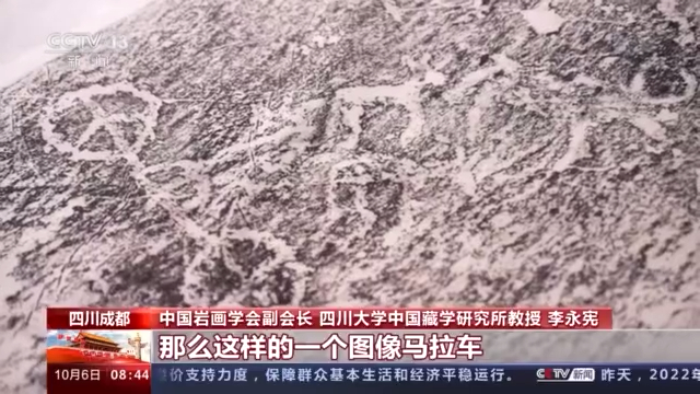 中國巖畫學會副會長、四川大學中國藏學研究所教授 李永憲:那么這樣的一個圖像馬拉車,騎馬的人、牦牛、三只鹿、公鹿,所有的動物、人物、車輛,它們都是朝一個方向行進。
