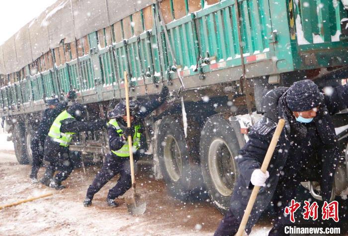 圖為2021年4月,國道109線安多段大雪致車輛通行困難,那曲市安多縣公安民警進行除雪保通。資料圖 西藏自治區公安廳供圖